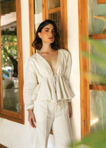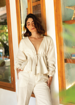 Linen top. Long sleeves with cuffs. Adjustables drawstring waist.