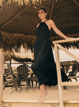 Flowy midi dress. Halter neck and adjustable cordon. In-seam side pockets.
