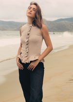 Sleeveless round neck top. Ruffled trim. Front button closure.